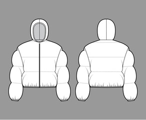 Down Puffer Coat Jacket Technical Fashion Illustration With Long Sleeves Hoody Collar Zip Up Closure Oversized Knee Length Flat Template Front Back White Color Style Women Men Unisex Top Cad Anorak Wall